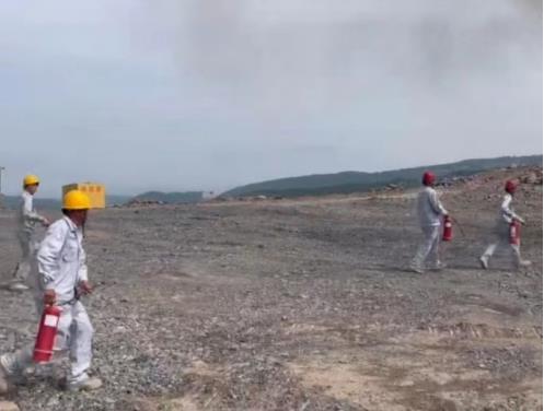 此次演練,災(zāi)情設(shè)定挖掘機在進行焊接作業(yè)時,焊接火花飛濺引燃一旁維修時使用的擦拭油料的棉紗,由于維修位置靠近清表時砍伐的樹木且臨近礦區(qū)邊緣林區(qū),由于當(dāng)天風(fēng)勢較大待發(fā)現(xiàn)時被砍伐的樹木已被引燃且火勢洶涌,發(fā)現(xiàn)火災(zāi)事故的員工立即通知帶班領(lǐng)導(dǎo)。帶班領(lǐng)導(dǎo)接到報告后,立即啟動應(yīng)急預(yù)案,組織人員進行滅火。