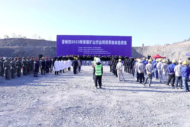 為進一步提升非煤礦山企業安全意識和應對突發事故的處置能力,晉城市 2023 年非煤礦山行業坍塌事故應急演練在晉城山水合聚水泥有限公司司家掌石灰巖礦(澤州分公司承建礦山)舉行。晉城市應急管理局、縣應急管理局、縣委宣傳部、縣衛健局、縣公安局、縣氣象局、縣消防救援大隊、縣自然資源局、晉城市救援救護隊、晉城市能源技術中心等 12 家單位120余人參與演練。市應急管理局三級調研員柳青、市應急管理局救援協調科邰建民、各縣區應急管理局負責人、分管負責人、非煤礦山行業相關科室負責人及全市所有非煤礦山企業主要負責人等 130 多人現場觀摩了演練。