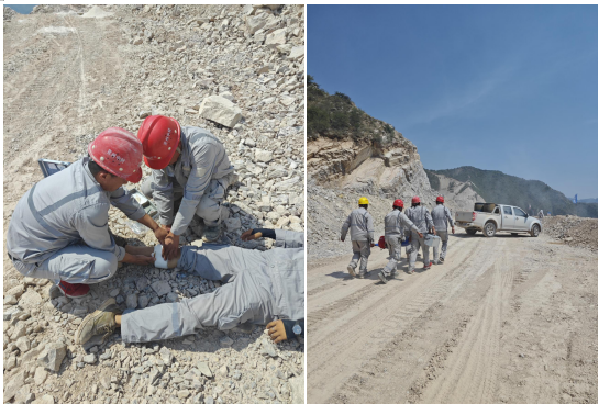 此次演練是模擬爆破后,爆破作業(yè)人員進(jìn)入爆破作業(yè)區(qū)域確定是否有無(wú)盲炮,由于爆破震動(dòng)產(chǎn)生巖體松動(dòng),爆破作業(yè)人員躲閃不及被落石砸傷,導(dǎo)致無(wú)法起身。事故發(fā)生后,分公司立即上報(bào)并啟動(dòng)放炮事故應(yīng)急預(yù)案,循序開(kāi)展救援。